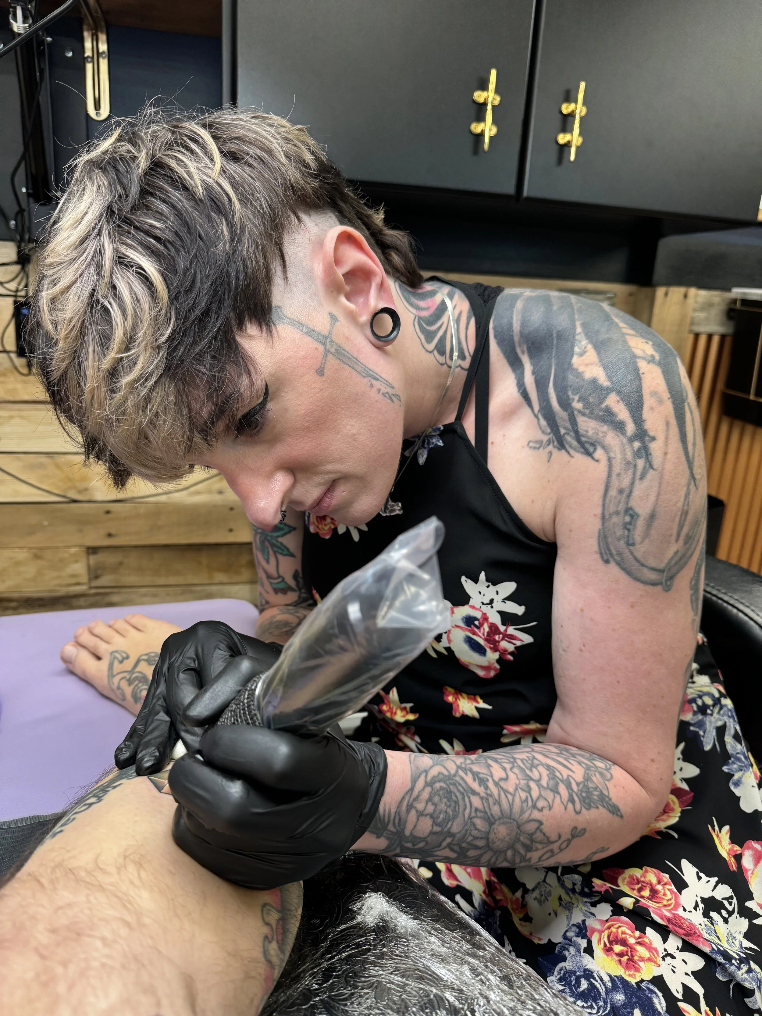 With over 11 years of tattooing experience, Krista Reid has seen a wide range of tattoo trends in the industry. Her story began much earlier. It was guided by a childhood love of her grandfather's American traditional tattoos from his time in the Coast Guard. She drew, painted, and colored anything she could get her hands on until her 18th birthday.